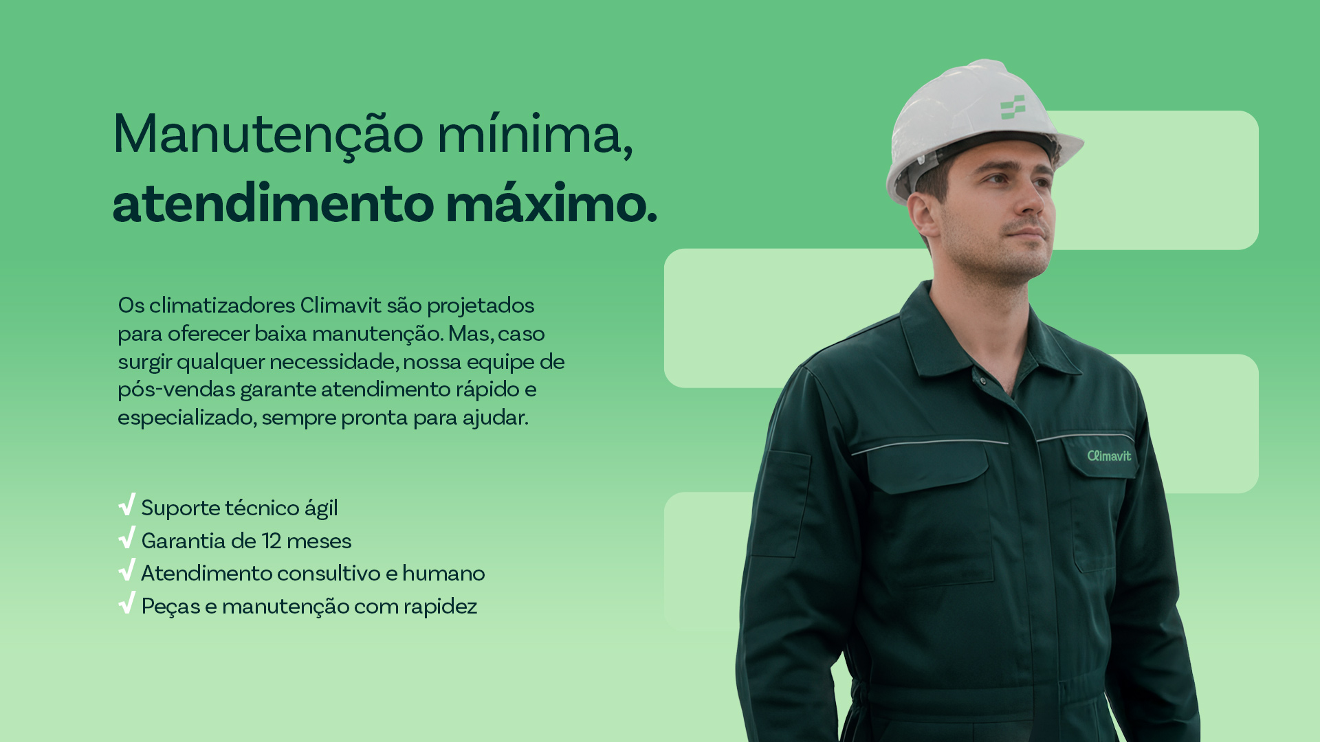 Não. Os climatizadores Climavit são projetados para manutenção mínima. E, se houver qualquer necessidade, nossa equipe de pós-vendas oferece suporte técnico rápido e especializado.